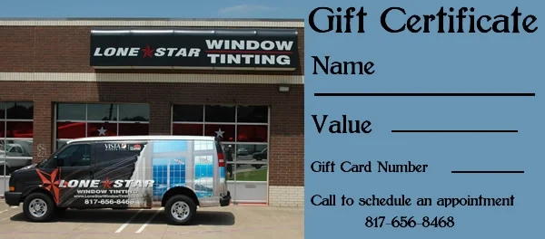 The best gift you can give your friends and family is the gift of comfort! Lone Star offers gift cards in any denomination, perfect for automotive window tinting, residential window film, or any window tint service in the Dallas/Fort Worth area.